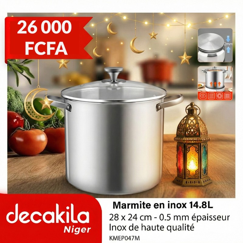 La marmite en inox Decakila de 14,8L (diamètre 28cm x hauteur 24cm) avec épaisseur 0,5mm est conçue pour les très grandes préparations nigériennes : sauces arachide pour 15-20 personnes, couscous complets, ragoûts de mouton ou riz pour baptêmes et mariages. L'inox premium assure une résistance exceptionnelle à la corrosion, hygiène parfaite et longévité même avec cuissons acides prolongées (tomates, tamarin, citron).