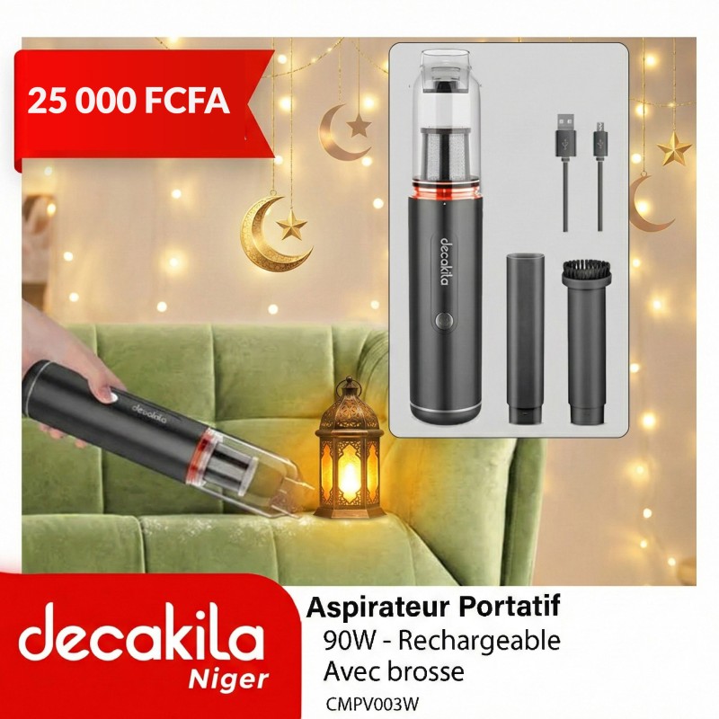 L'aspirateur portatif rechargeable Decakila 90W est l'accessoire indispensable pour nettoyer rapidement voiture, canapés, clavier ordinateur, étagères ou tapis de prière. Sa puissance de 90W aspire efficacement poussières fines, miettes, poils d'animaux et petits débris, même dans les angles difficiles. Batterie lithium-ion offrant jusqu'à 25 minutes d'autonomie continue, charge USB-C rapide (2-3h), poids ultra-léger (500-600g) pour une utilisation prolongée sans fatigue.